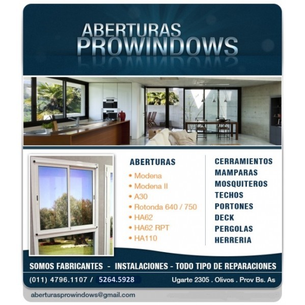 SOMOS UNA EMPRESA ENFOCADA A LA FABRICACION DE TODO TIPO DE ABERTURAS EN ALUMINIO Y PVC TAMBIEN EN REPARACIONES,TRABAJOS DE HERRERIA,PUERTAS PLACAS Y DE CHAPA REFORZADA.